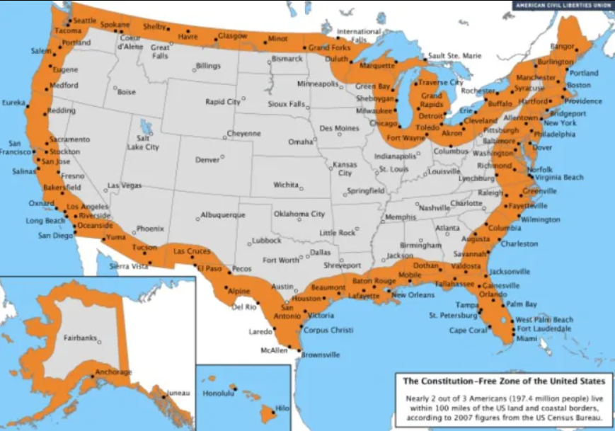 Please take note of the map image left. This image is of a 2007 update initiative that took place under the Washington, District of Columbia Administration of that time period to this festering Supreme Court issue provisioned by the Immigration and Nationality Act (INA). Through this directive those American counties that falls within 100 direct air miles inland, from all State boundaries are considered a “Constitution-Free Zone” – a decades old federal statute within the U.S. Customs and Border Patrol (CBP) to facilitate its over 300 ports of entry (and beyond).